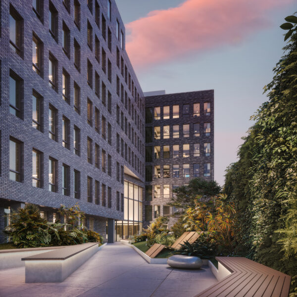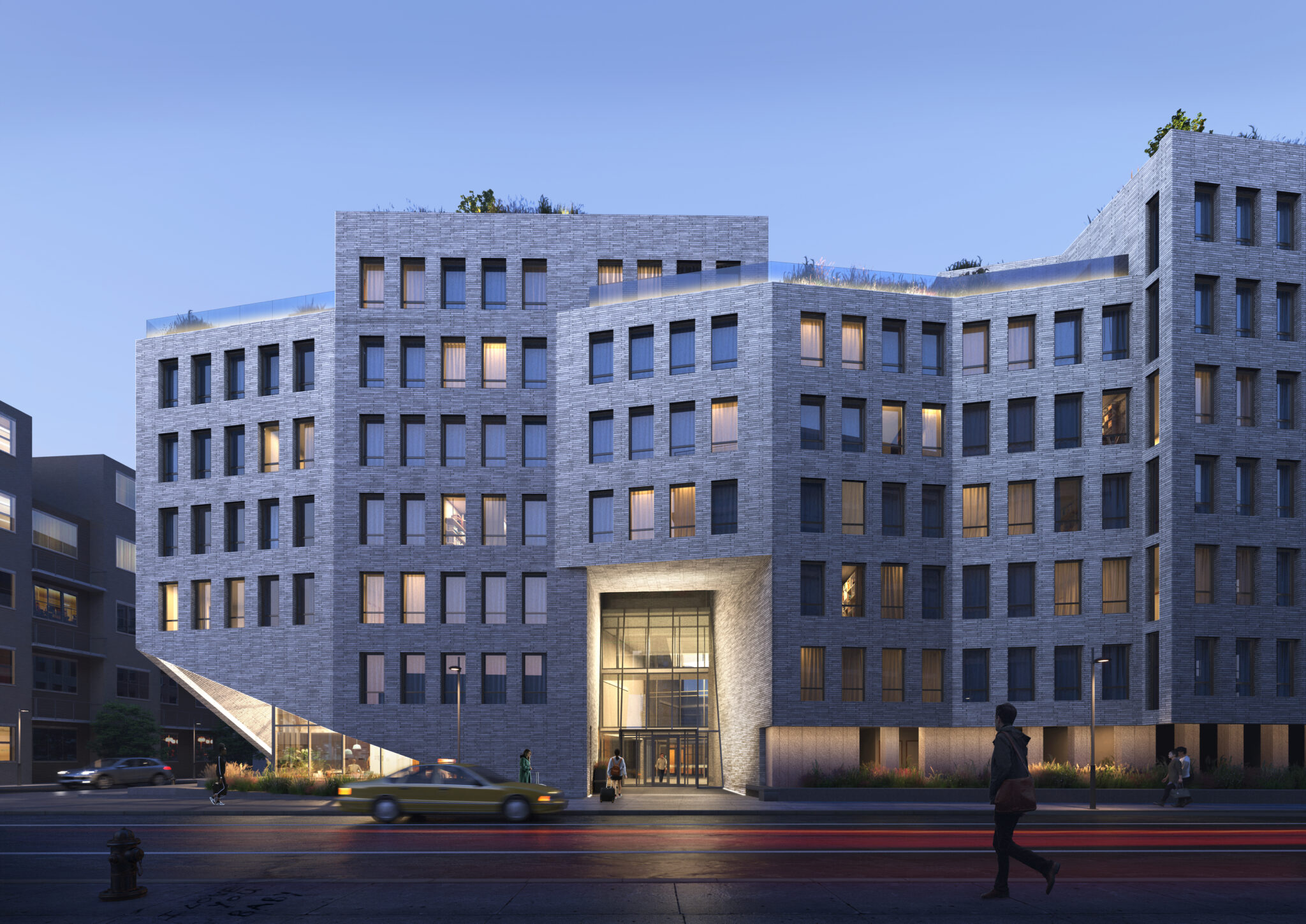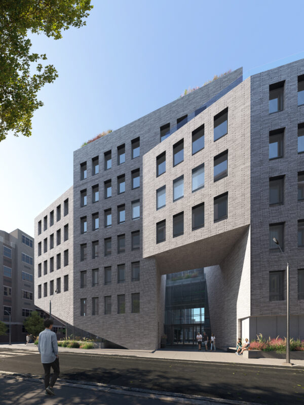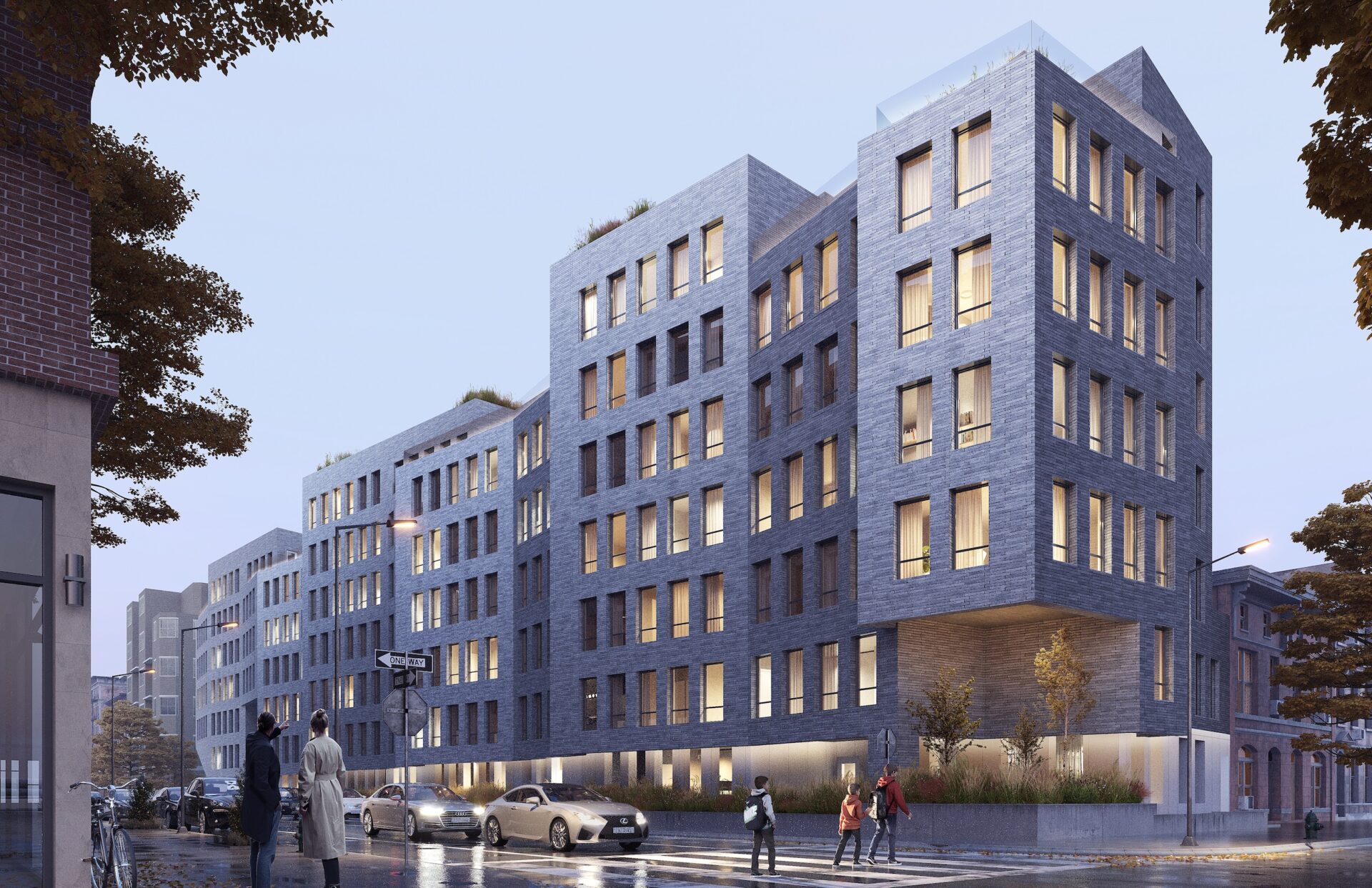 The building was envisioned as a sculptural addition to the neighborhood, characterized by a textural brick exterior with oscillating facets which create rhythm and scale, reminiscent of quaint and traditional row house streets Brooklyn is known for. The sculptural articulation of the facade serves to enhance the user experience by providing multi-directional views and a varying daylighting experience for many of the street-facing units, while also providing a unique streetscape and a welcome point of interest to the surrounding context. The building is elevated off the ground and the street corners open to allow for street-side seating, and encourages engagement between the building and pedestrians.