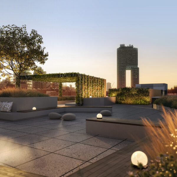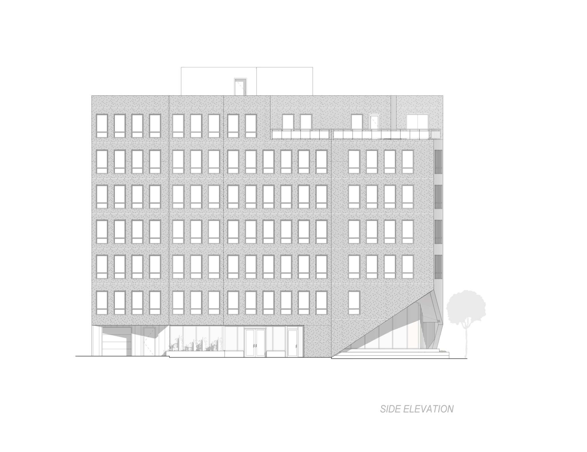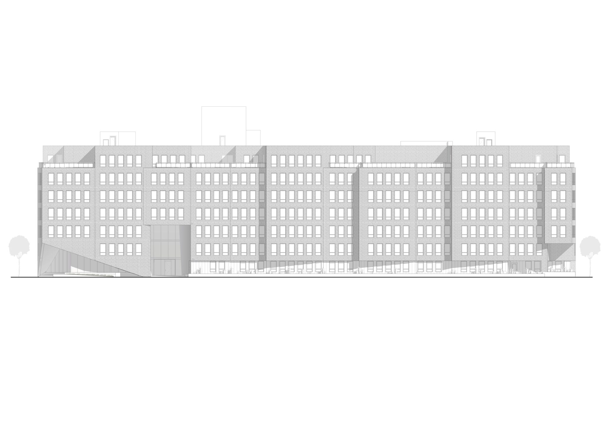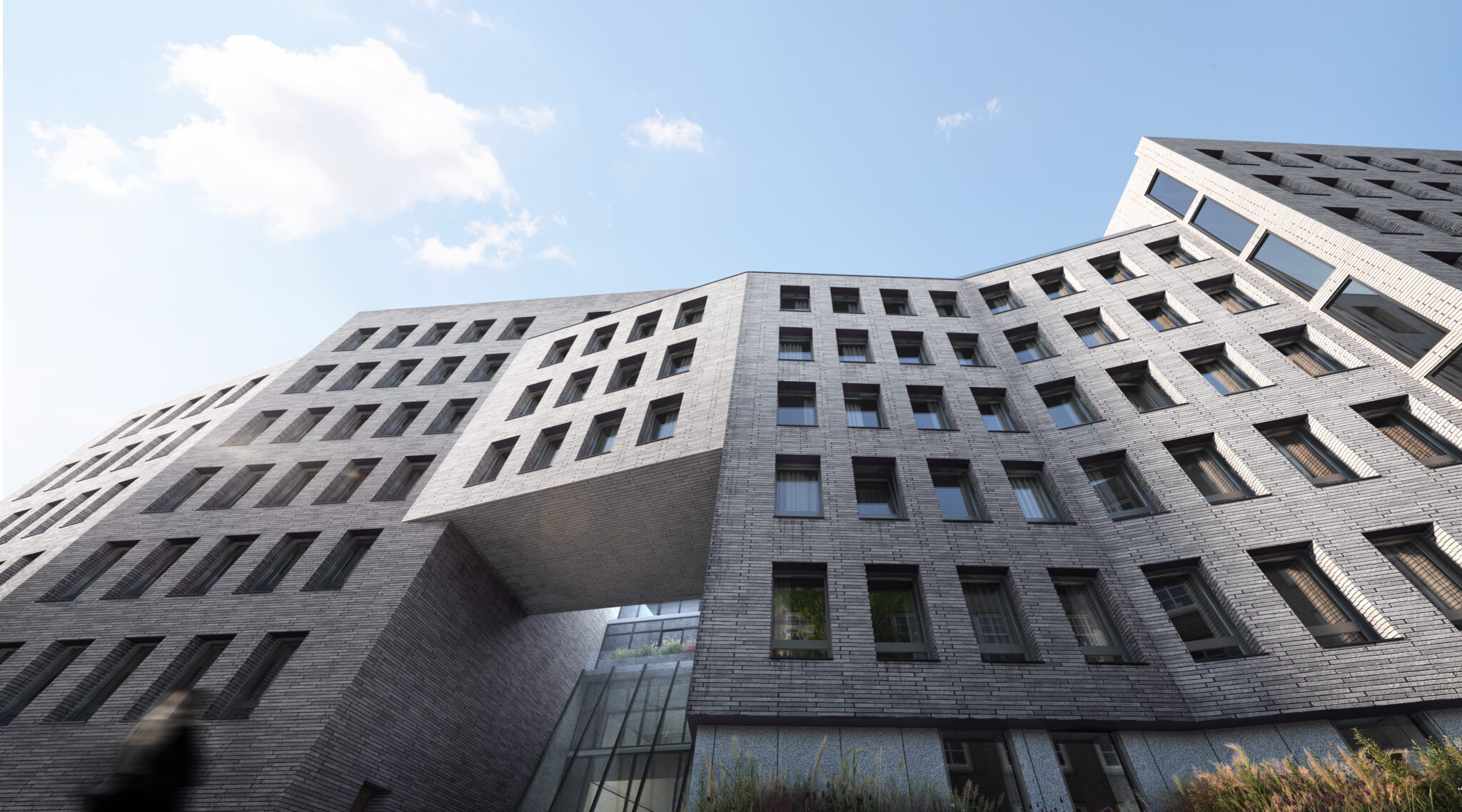 The building was envisioned as a sculptural addition to the neighborhood, characterized by a textural brick exterior with oscillating facets which create rhythm and scale, reminiscent of quaint and traditional row house streets Brooklyn is known for. The sculptural articulation of the facade serves to enhance the user experience by providing multi-directional views and a varying daylighting experience for many of the street-facing units, while also providing a unique streetscape and a welcome point of interest to the surrounding context. The building is elevated off the ground and the street corners open to allow for street-side seating, and encourages engagement between the building and pedestrians.