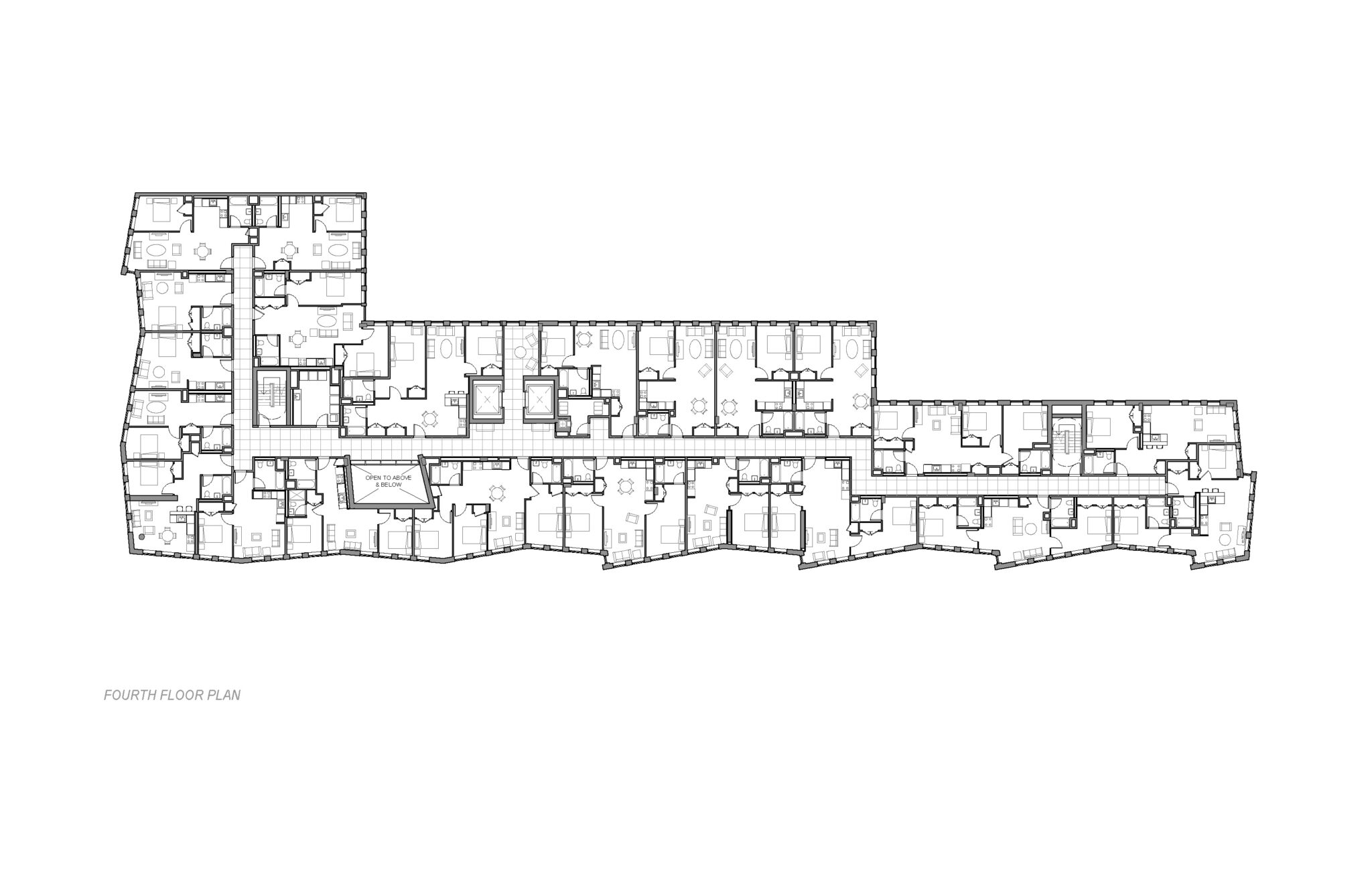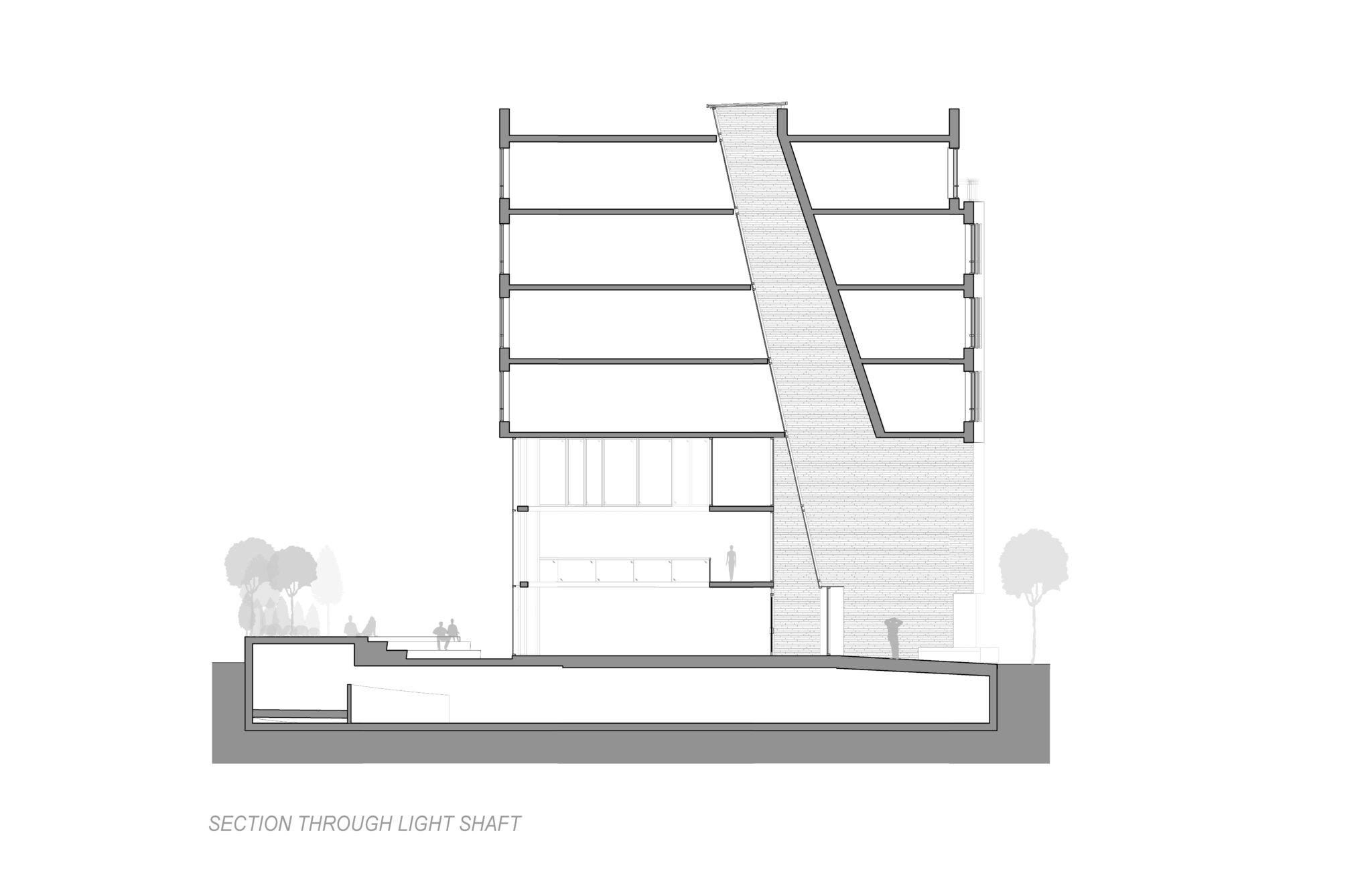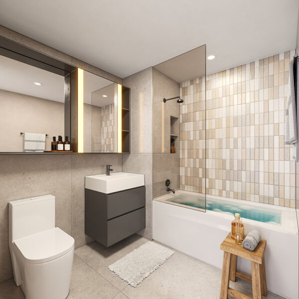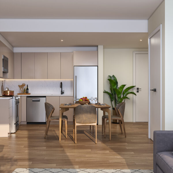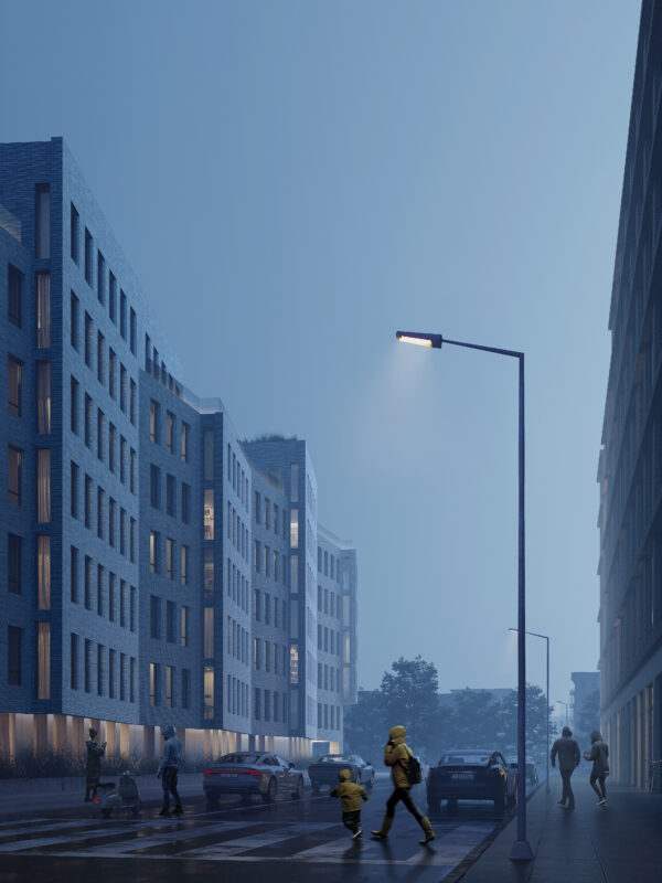 The building’s exterior form and materials extend to the interior transitional spaces, creating many unique moments of contemplation. The corridor spaces are illuminated at every floor and enlivened with natural daylight through an iconic light well carved into the heart of the building. The light well is designed so that on the summer solstice, daylight precisely reaches the bottom of the well, which coincides with the main building entrance as a special welcome to residents and visitors. The light gradually recedes in the months leading to the winter solstice, creating a dynamic experience throughout the year.