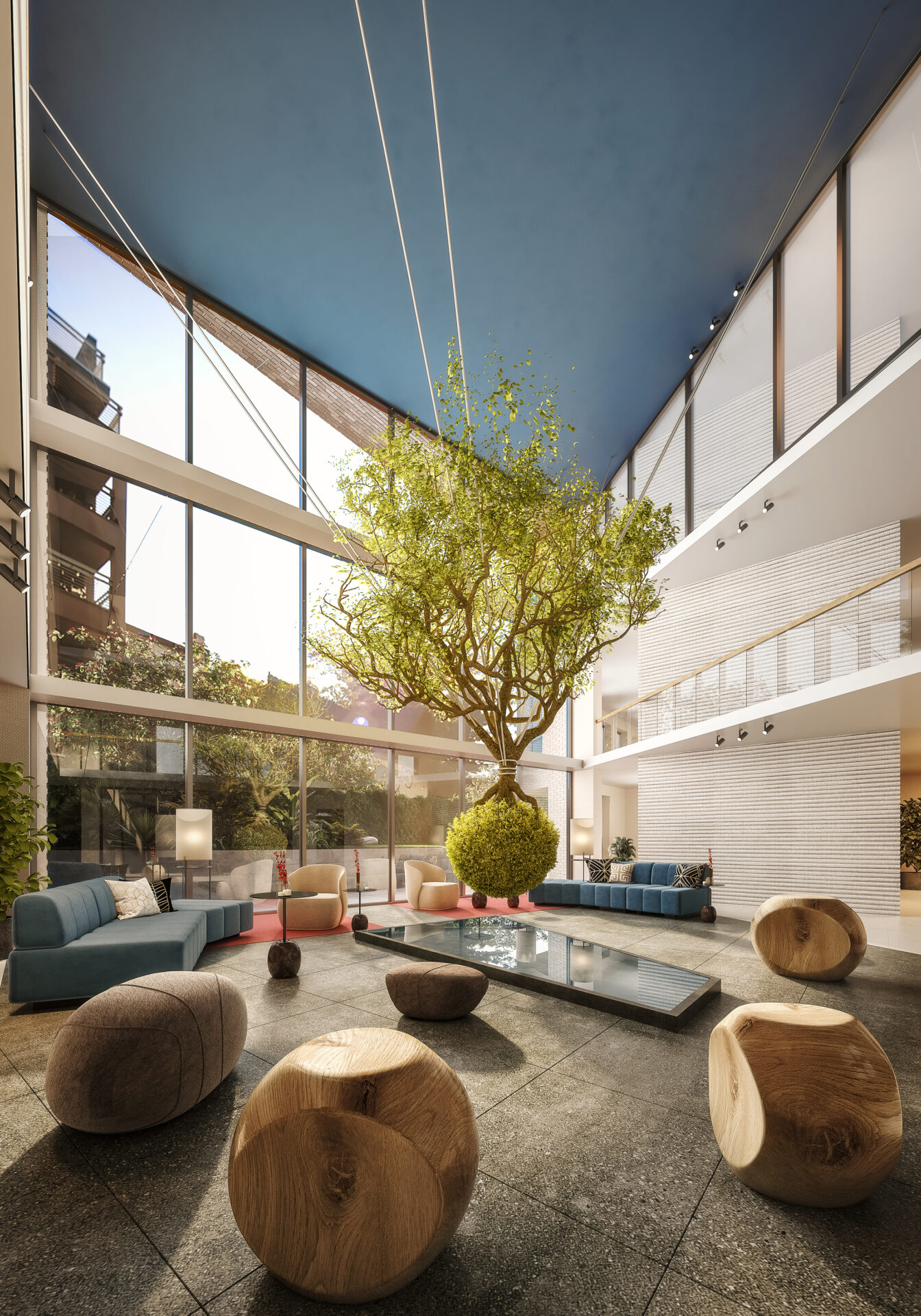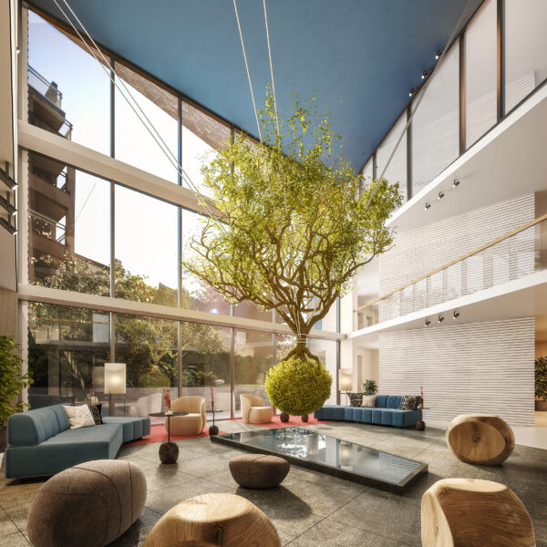 The building offers a variety of gathering areas including a central 3 story lobby atrium and outdoor spaces that create a connection to nature as well as promote a sense of community. From a tranquil zen garden to a walk in the park, the design promotes a symbiotic relationship between the natural world and the built environment. A collaboration with local artists provides an olive tree in the central atrium space as a hanging sculpture which reflects in the water pool below. The double height co-working space is crafted to create an inviting area for collaboration and where users can admire permanent art installations. It is the hope and goal that this building fosters community and well-being to its residents and becomes a new source of inspiration to the neighborhood as a whole.
