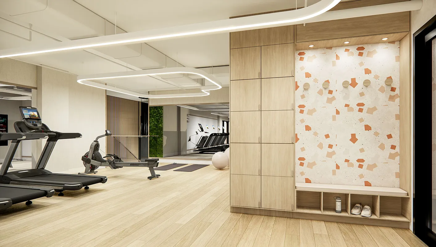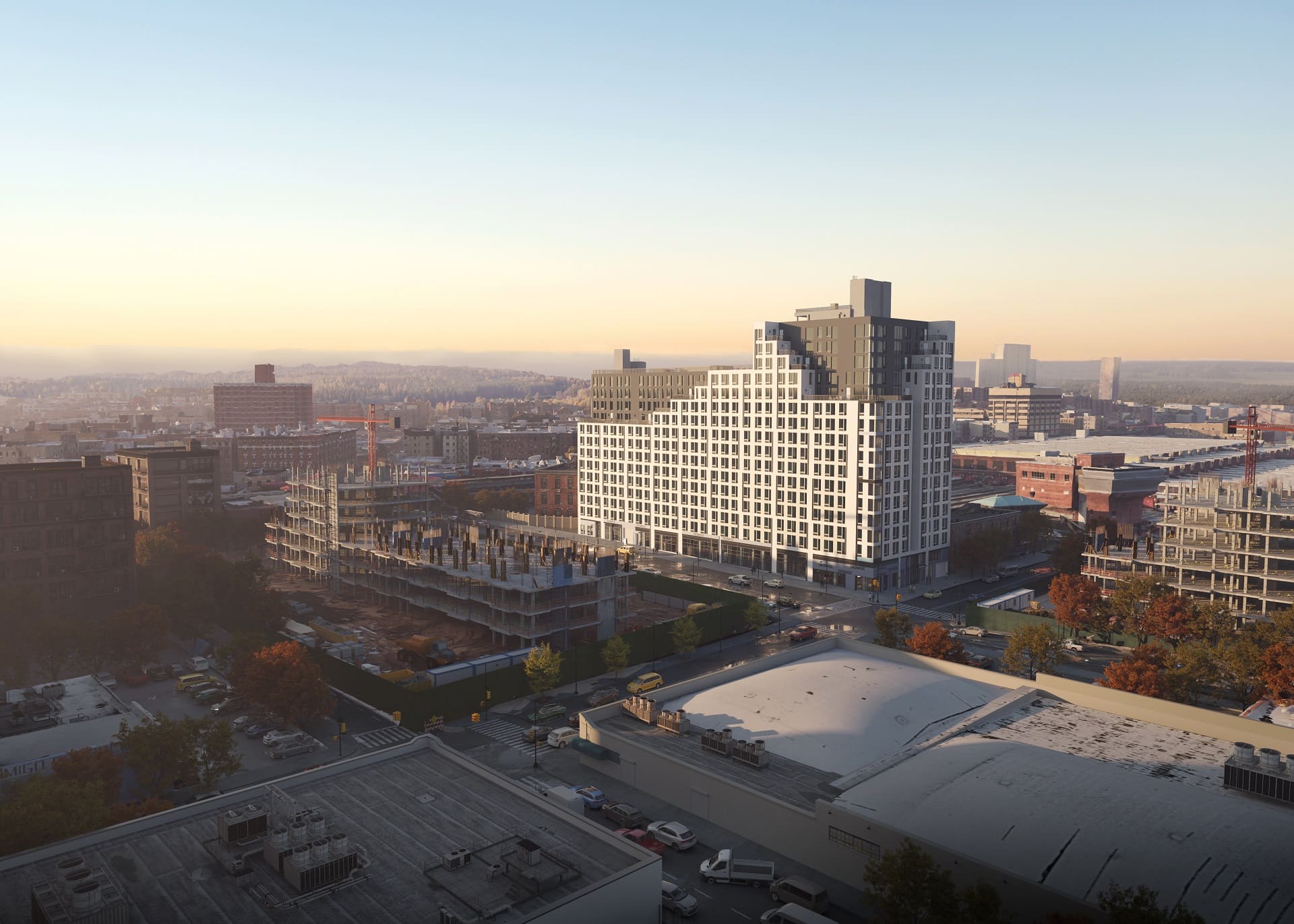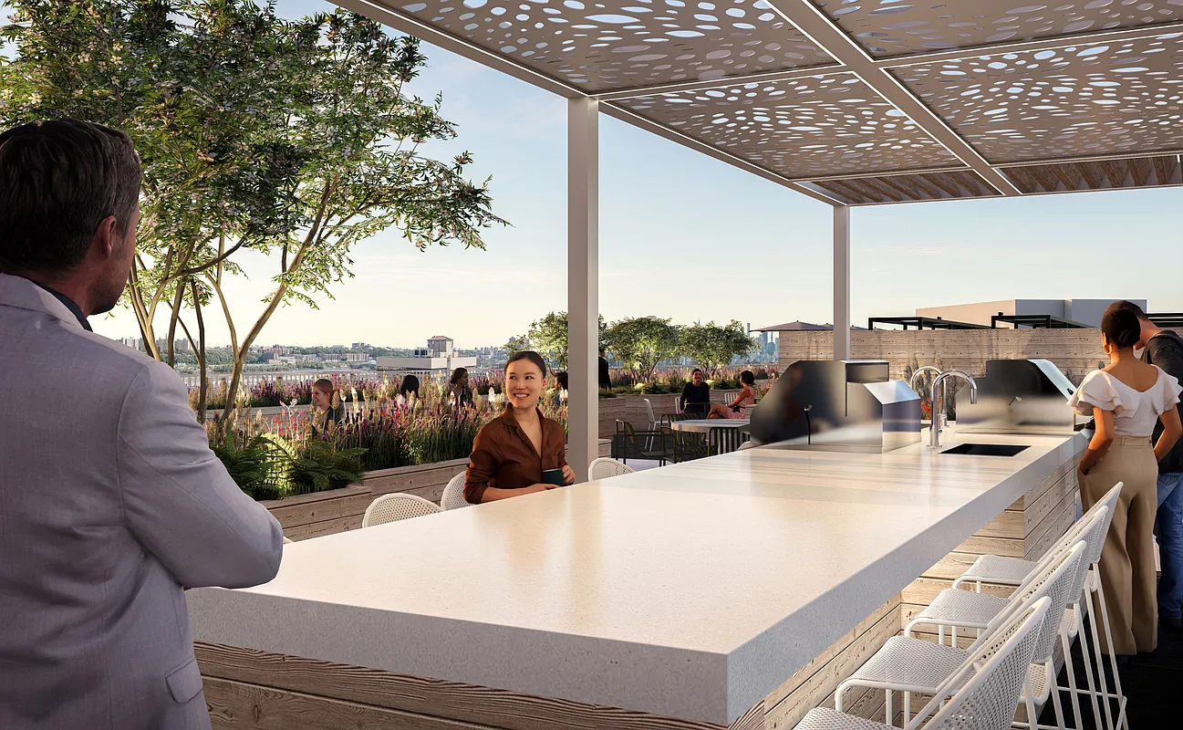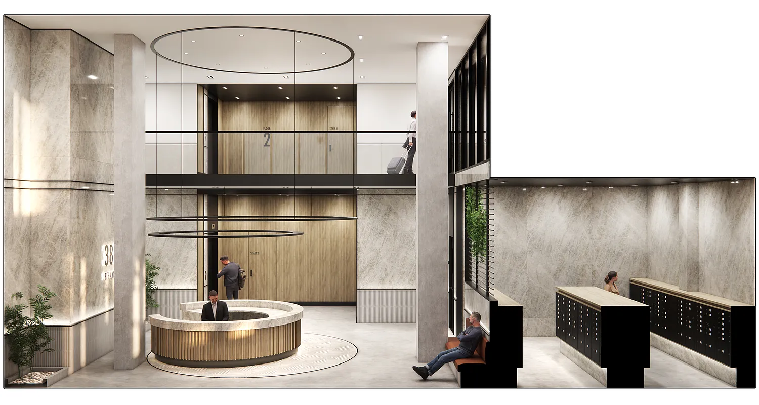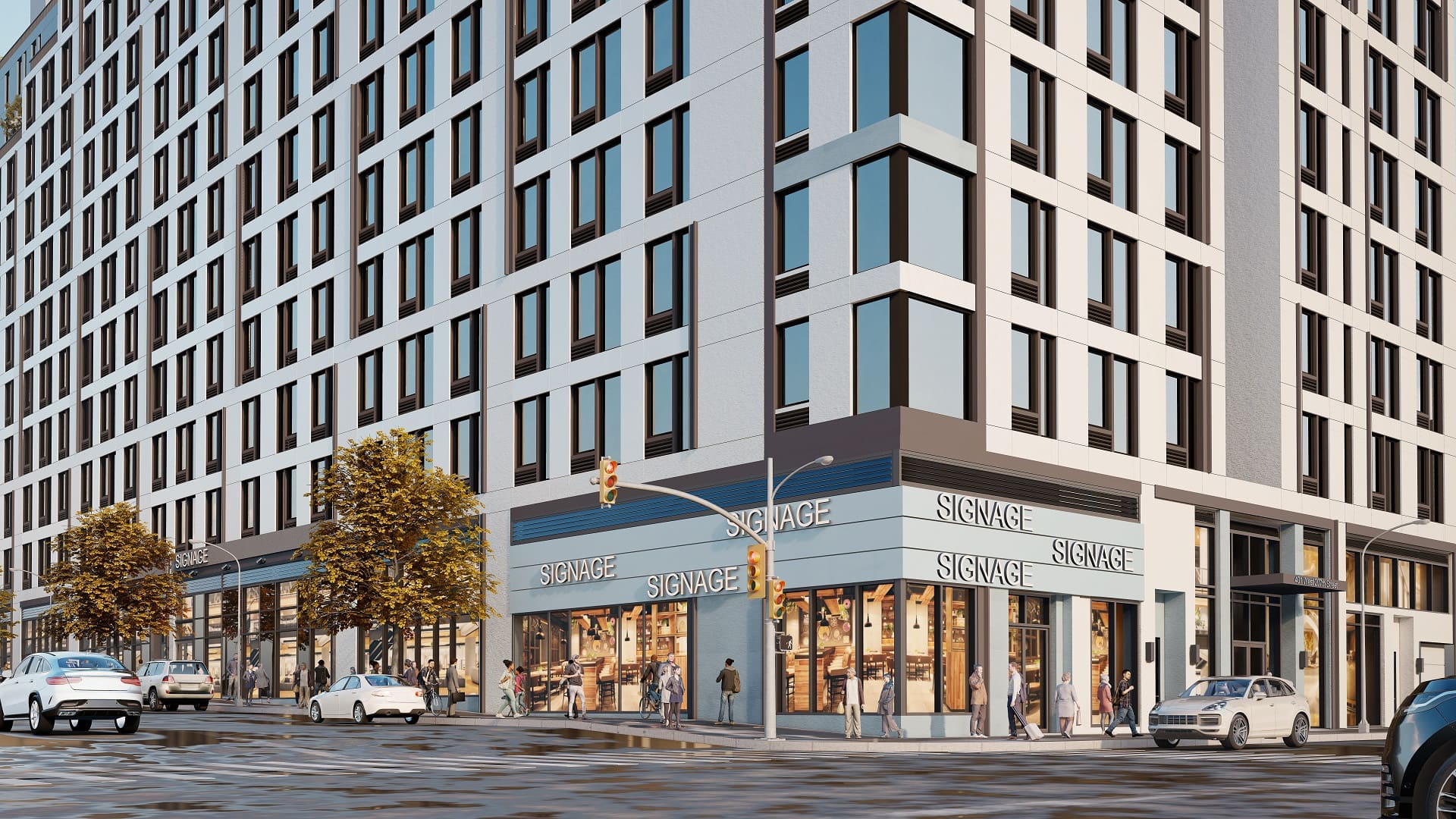 Within the R8A zoning area, the building steps up to the 14-story height limit, establishing a consistent street wall and reinforcing the surrounding mid-rise scale. As the site transitions into the R9A district, the building rises to a maximum of 17 stories. Upper-level stepping and setbacks are carefully calibrated to comply with NYC Zoning Resolution requirements, producing a terraced form that reduces perceived bulk while preserving light and air at the street.