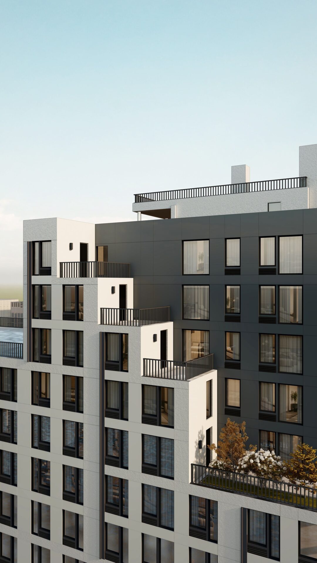 Within the R8A zoning area, the building steps up to the 14-story height limit, establishing a consistent street wall and reinforcing the surrounding mid-rise scale. As the site transitions into the R9A district, the building rises to a maximum of 17 stories. Upper-level stepping and setbacks are carefully calibrated to comply with NYC Zoning Resolution requirements, producing a terraced form that reduces perceived bulk while preserving light and air at the street.