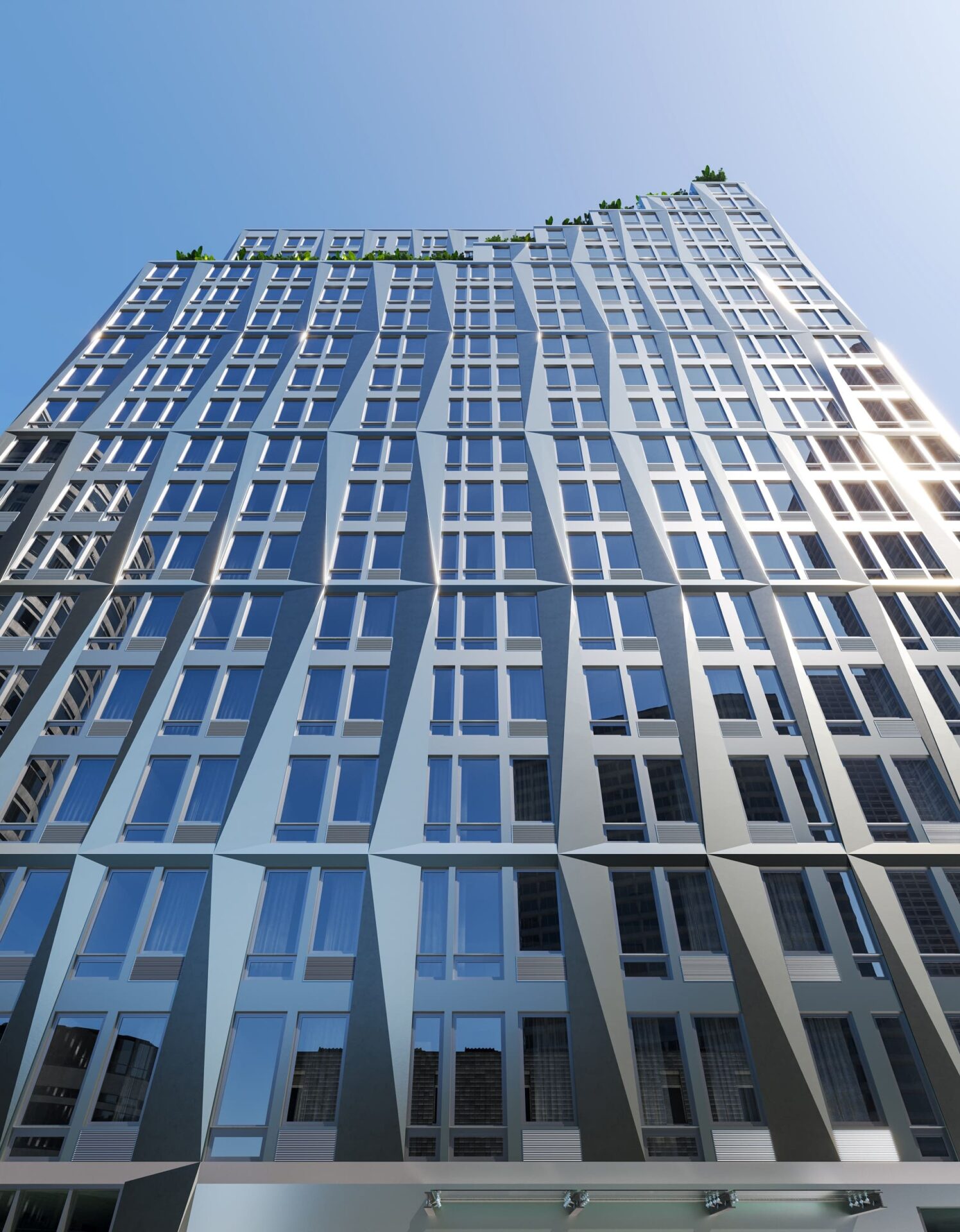 Known as Ripple, the building takes its name from the way light animates its folded 3D façade throughout the day. An undulating metal panel skin wraps the structure in a dynamic surface of reflection and motion, shifting subtly from cool silvers to warm, golden tones as sunlight travels across it. This ever-changing exterior creates a sense of movement and depth, allowing the building to feel alive, responsive to both sky and street.